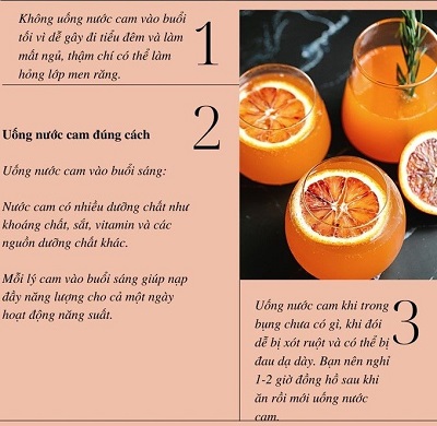 Nước cam chứa nhiều axit nên tuyệt đối không uống vào lúc đói, sẽ ảnh hưởng đến niêm mạc dạ dày.